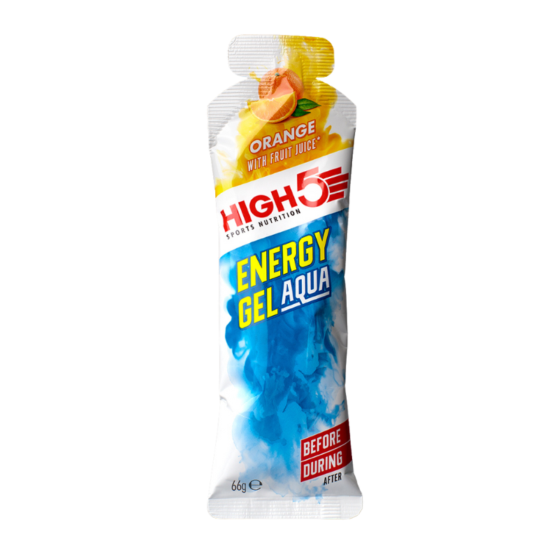 High5 Energy Gel Aqua Orange er lavet på ægte frugtjuice og har en frisk smag af applesin. Konsistensen i Aqua Gels er tilsat vand, hvilket gør den endnu mere flydende og let at indtage.