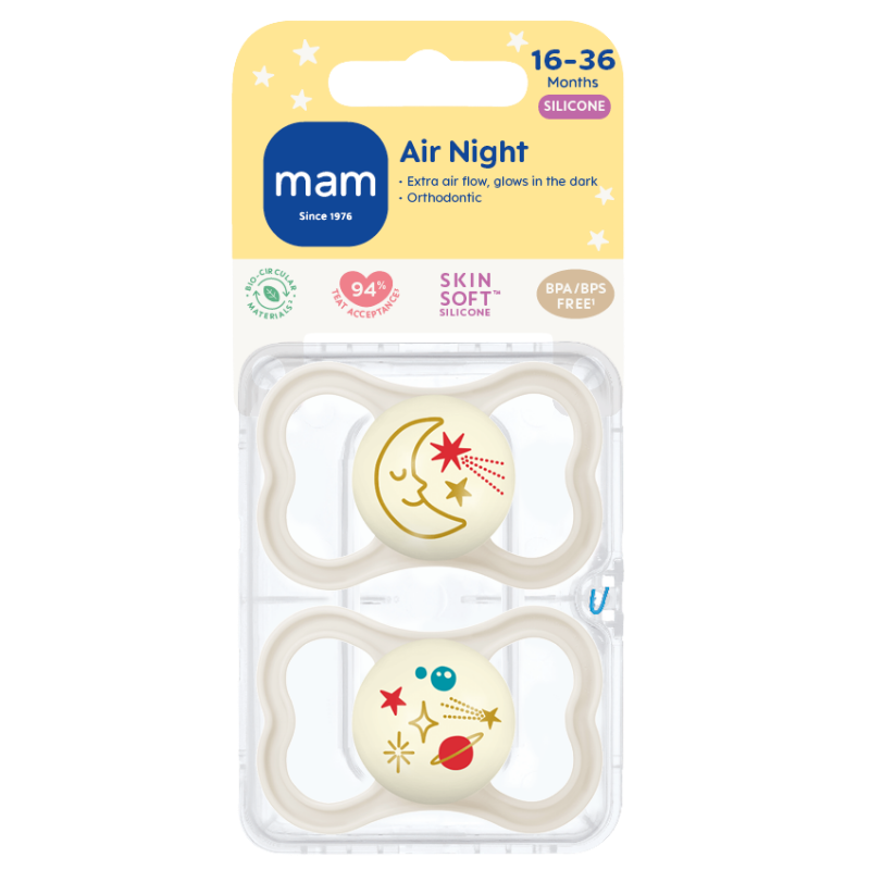 MAM Air Night sutten er designet til at være skånsom mod dit barns følsomme hud takket være store lufthuller. Den selvlysende knop gør den nem at finde om natten, og den bløde SkinSoftTM-silikone føles velkendt og tryg for barnet.