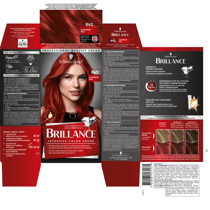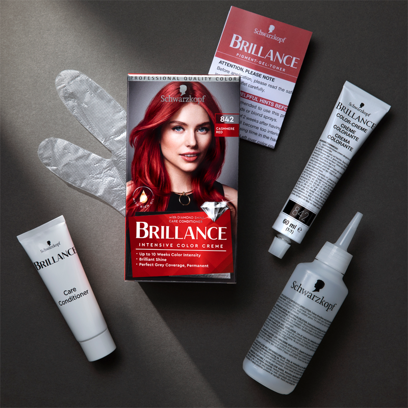 Opnå en intens og strålende rød farve med Schwarzkopf Brillance 842 Cashmere Red. Denne permanente hårfarve giver dit hår en cashmere-blød følelse og en langvarig glans.