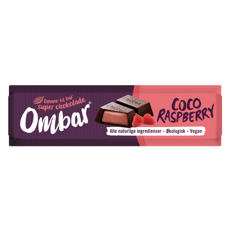 Nyd en lækker chokoladeoplevelse med god samvittighed. Denne økologiske chokoladebar fra Ombar byder på en elegant balance mellem rig chokolade, sød kokos og friske hindbær, skabt til den bevidste chokoladeelsker.