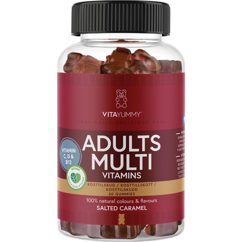 VitaYummy Adults Multi Salted Caramel: Vegansk vingummi med essentielle vitaminer, mineraler og naturlige farver—støtter energi, immunforsvar og velvære med lækker smag.