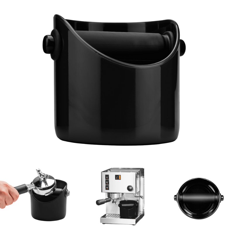 En kompakt knockbox til kaffegrums samt drypbakke til espressomaskine