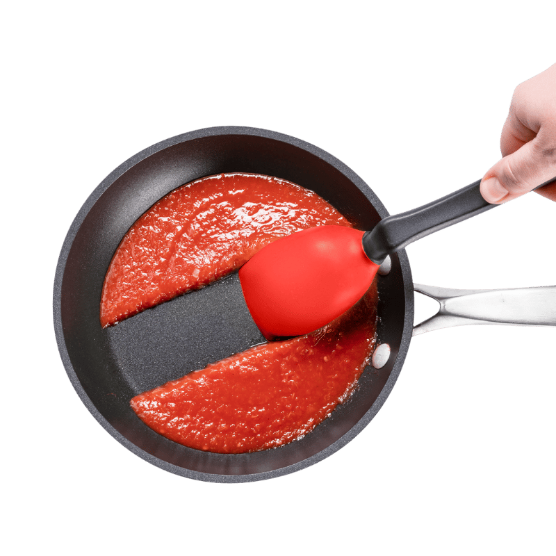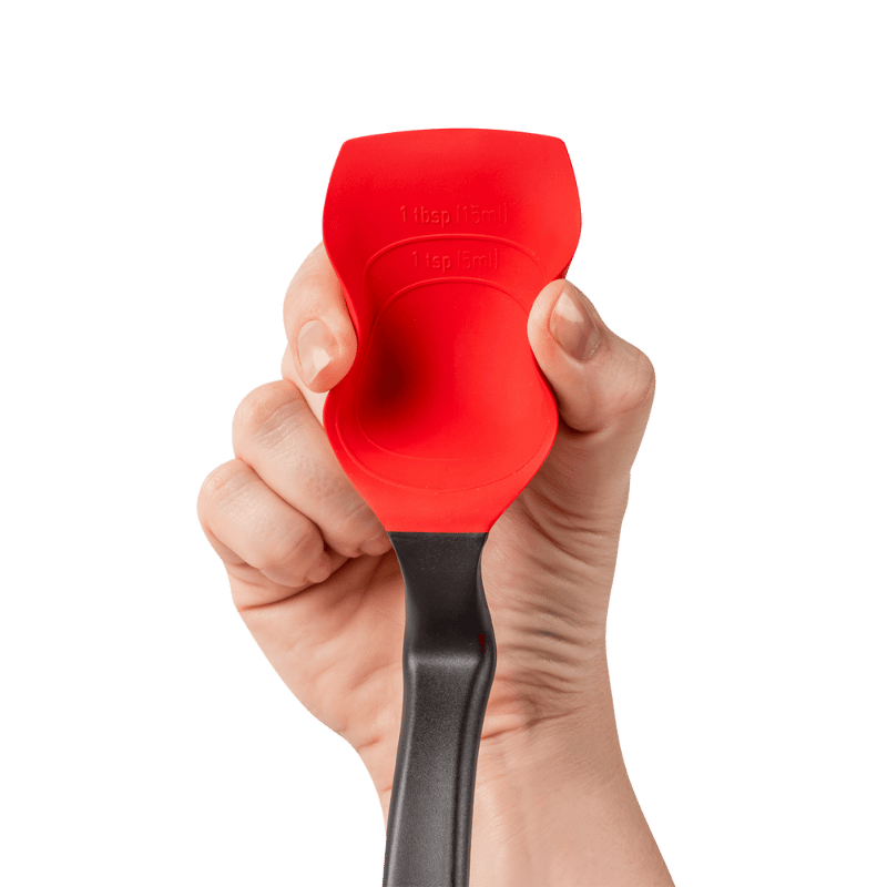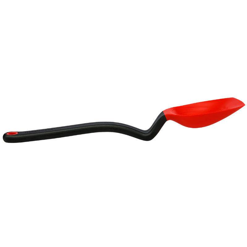 Supoon fra Dreamfarm er en fantastisk grydeske i et stilsikkert, innovativt design. Den har en flad gummiskraberspids og fleksible sider til at skrabe din pande eller skål helt ren. Håndtaget er ensartet vægtet, så skeen ikke vælter ud af sauceskålen. Der er måleenheder (15 ml spsk & 5 ml tsk) i skeens hoved, så ud over at Supoon har en fantastisk skrabefunktion, kan du måle, røre, blande, øse og servere med den samme ske. Supoon er designet med et knæk på håndtaget, som gør, at den ikke kommer i kontakt med underlaget. Silikoneskeen er sikker at bruge på non-stick køkkengrej og er varmebestandig op til 260°C / 500°F. Materiale er nylon og silikone. Tåler opvaskemaskine. Fri for BPA.Ingredienser