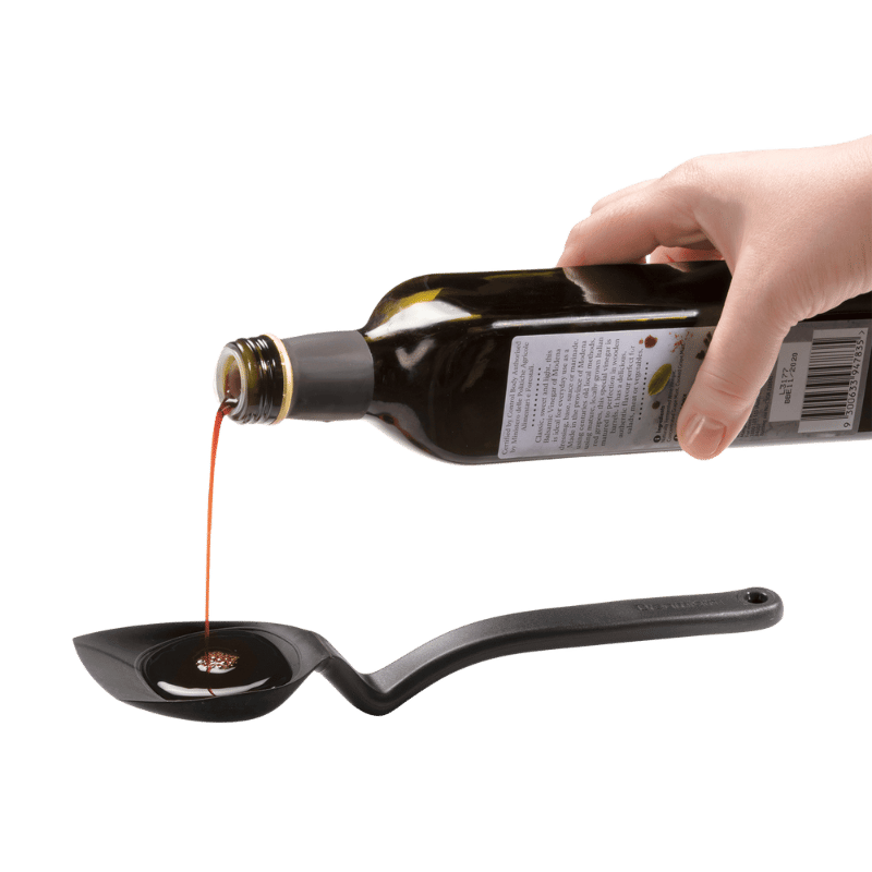 Supoon fra Dreamfarm er en fantastisk grydeske i et stilsikkert, innovativt design. Den har en flad gummiskraberspids og fleksible sider til at skrabe din pande eller skål helt ren. Håndtaget er ensartet vægtet, så skeen ikke vælter ud af sauceskålen. Der er måleenheder (15 ml spsk & 5 ml tsk) i skeens hoved, så ud over at Supoon har en fantastisk skrabefunktion, kan du måle, røre, blande, øse og servere med den samme ske. Supoon er designet med et knæk på håndtaget, som gør, at den ikke kommer i kontakt med underlaget. Silikoneskeen er sikker at bruge på non-stick køkkengrej og er varmebestandig op til 260°C / 500°F. Materiale er nylon og silikone. Tåler opvaskemaskine. Fri for BPA.Ingredienser