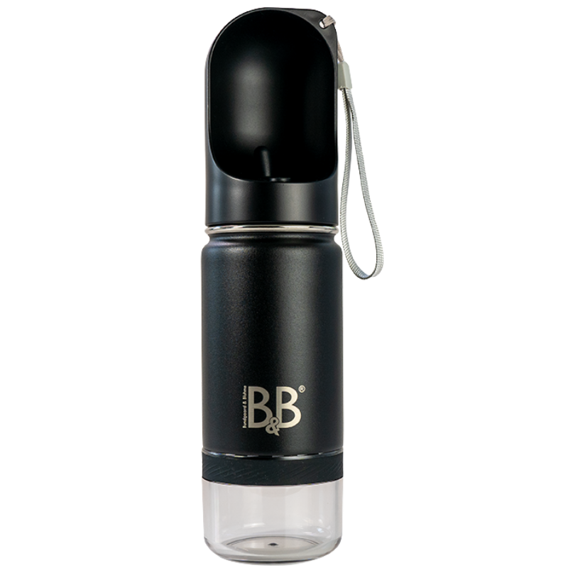 B&B Luksus 3i1flaske er den ultimative følgesvend til enhver hundeejer på farten. Denne flaske kombinerer tre funktioner i én: den har en dobbeltsidet rustfrit stålflaske til vand, en beholder til opbevaring af foder eller godbidder.