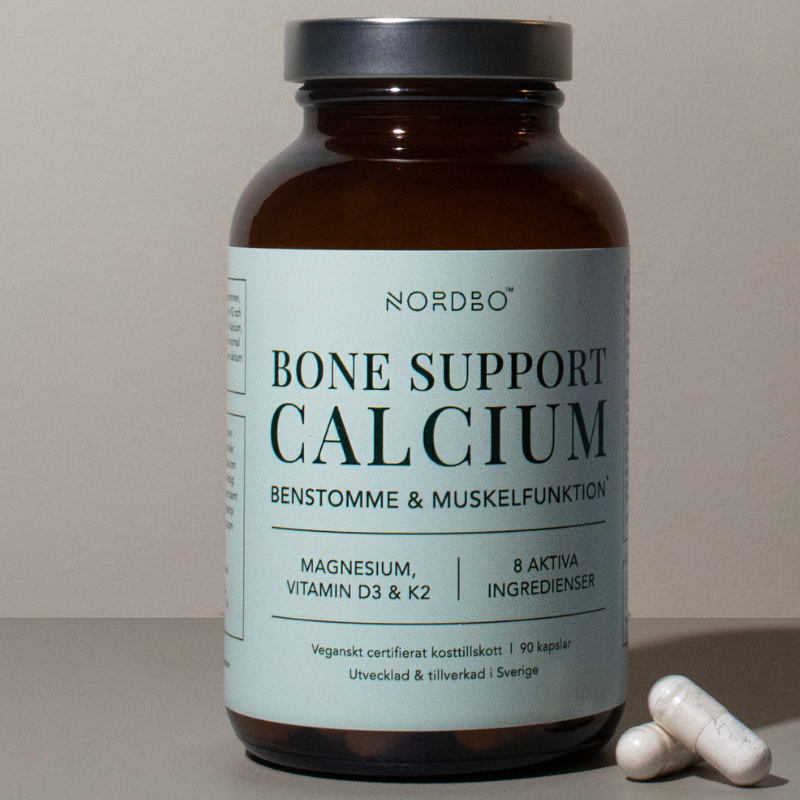 NORDBO Bone Support Calcium indeholder calcium i form af calciummalat kombineret med magnesiumbisglycinat, silicium, zinkpikolinat, bor, vitamin K2, vitamin D3 og mangan. Produktet indeholder i alt 8 aktive ingredienser.