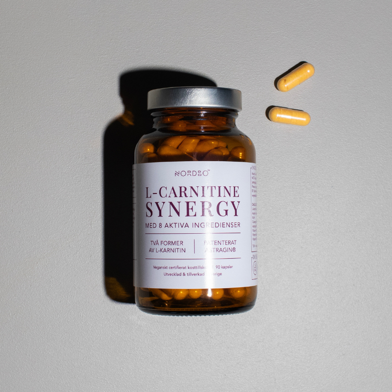 NORDBO L-Carnitine Synergy indeholder to former for L-carnitin (acetyl-L-carnitin og L-carnitin-L-tartrat) kombineret med cholin, coenzym Q10, Astragin® og vitamin B1, B6 og B12.