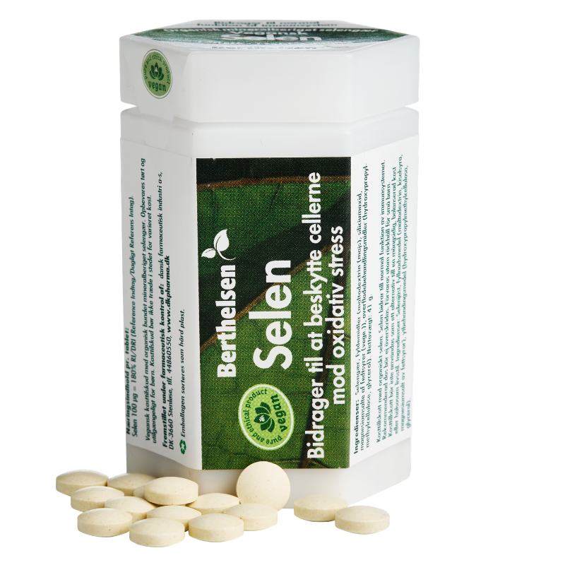 Berthelsen Selen 100 µg støtter immunforsvar, hår, negle og fertilitet. Vegansk, letoptagelig og fri for gluten, laktose og sødestoffer.