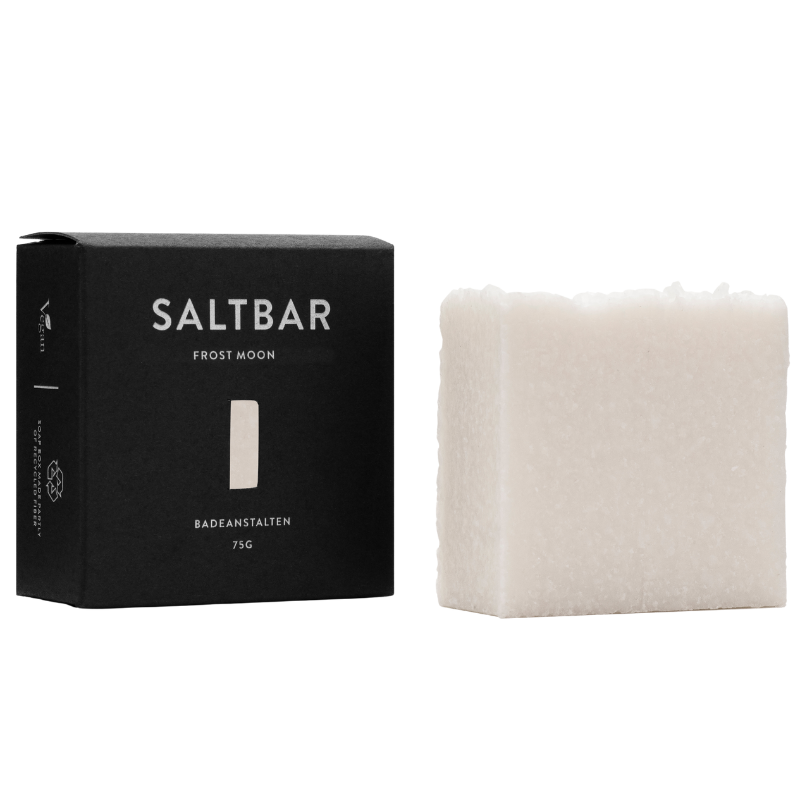 Badeanstalten Saltbar Frostmåne er det bedste af to verdener. Denne saltbar er nemlig både en salt og en sæbe i en. Den giver dig dermed saltets blødgørende effekt, sammen med sæbens skånsomme og milde vaskeevne.