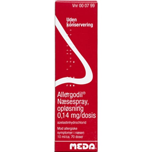 Allergodil Næsespray dæmper din overfølsomhedstilstand som høfeber, dyrehårsallergi og allergi i øjnene. Midlet virker ved at hæmme virkningen af histamin og andre kraftigt virkende stoffer, som frigives i kroppen ved udviklingen af den allergiske reaktion.