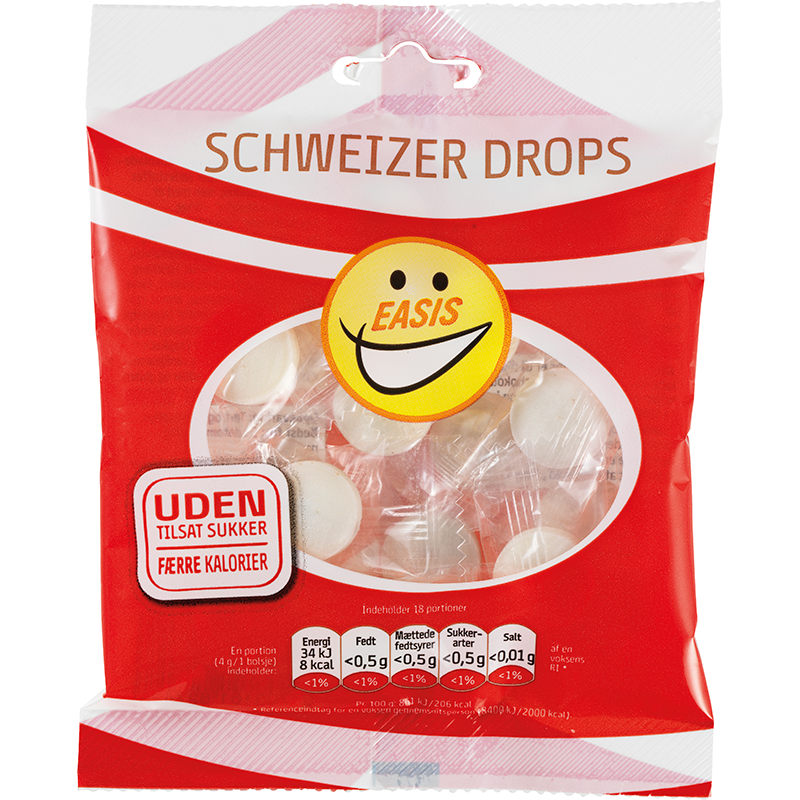Bolsjerne indeholder kun naturlig sukker, er sødet med sødestoffer og har et indhold af fiber, så derfor indeholder de halv så mange kalorier som traditionelle Schweizerdrops.