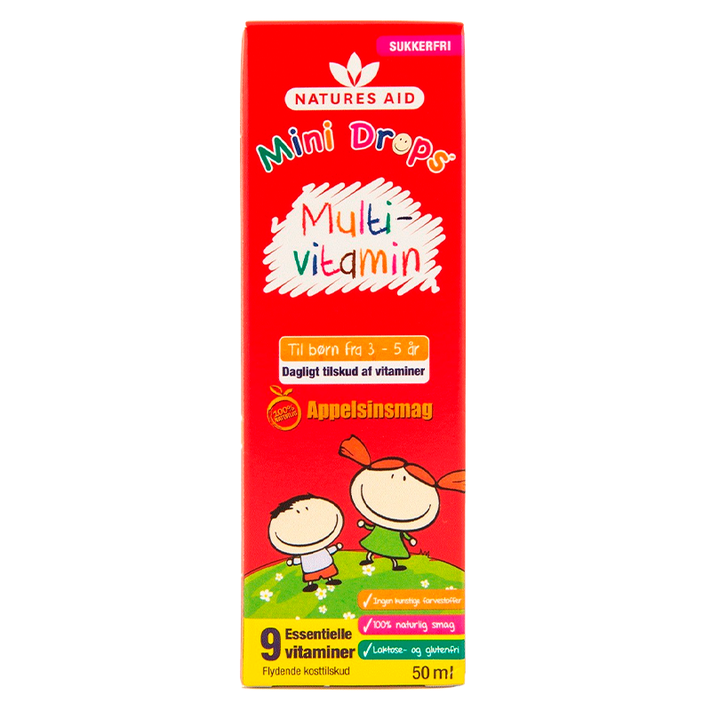Værd at vide om Natures Aid Mini Drops Multivitamin - Appelsinsmag (50 ml):