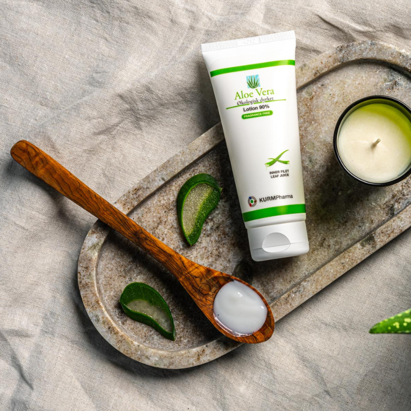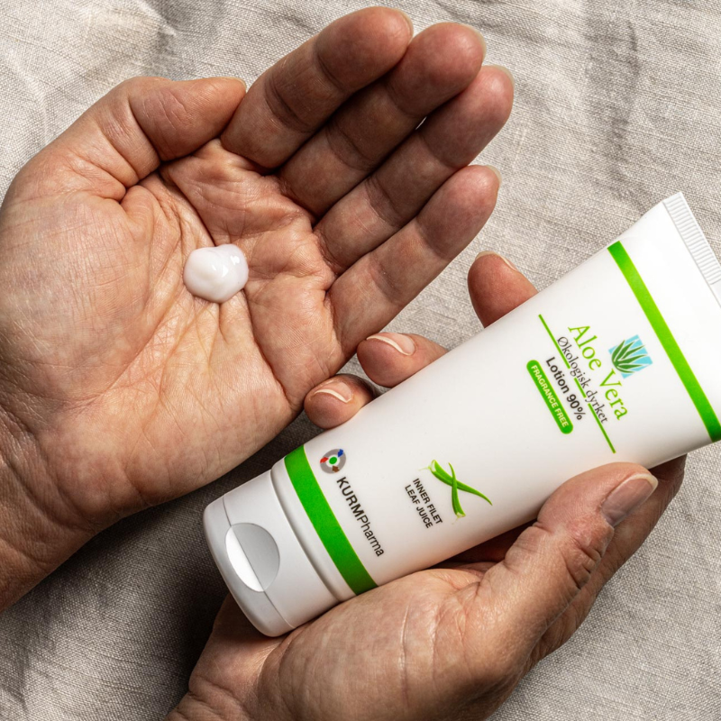 Giv din hud dybdegående fugt og næring med KURM Aloe Vera Lotion. Denne lette og hurtigtabsorberende lotion med 90% aloe vera er ideel til daglig pleje og som aftersun. Den er uden parfume og efterlader huden blød og velplejet.