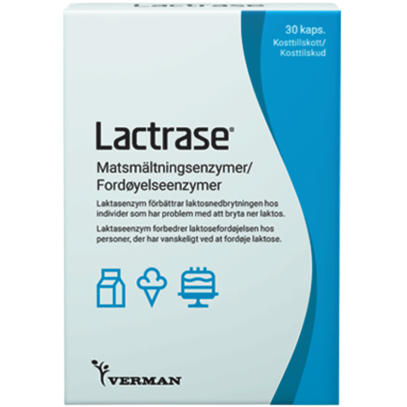 Verman Lactrase (30 kaps) (Biosym) er et kosttilskud, der indeholder 5000 FCC standardiseret laktaseenzym pr. kapsel, som dokumenteret forbedrer laktosefordøjelsen hos personer, der har vanskeligt ved at fordøje laktose. Laktaseenzymet hjælper kroppen med at nedbryde laktose, så du kan nyde mælkeprodukter og mad tilberedt med laktoseholdige ingredienser – også selvom du har laktoseintolerans.