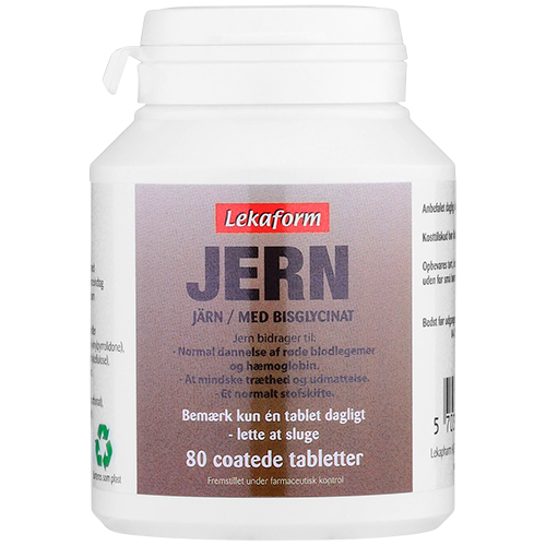 LEKAFORM Jern 80 stk. med Bisglycinat. Jern bidrager til normal dannelse af røde blodlegemer og hæmoglobin. Jern bidrager til at mindske træthed og udmattelse. Jern bidrager til et normalt energistofskifte.