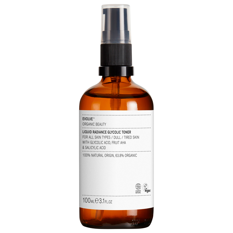 Evolve Organic Beauty Liquid Radiance Glycolic Toner er en peeling i flydende form, der giver glat og fin hud.
