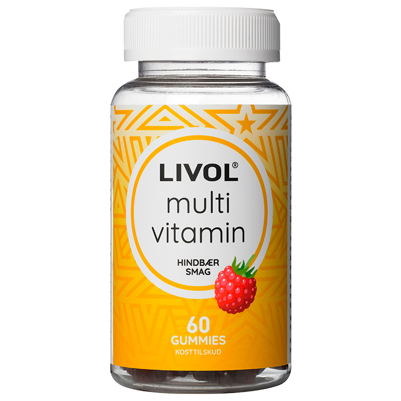 Livol Ultimate You Multi Raspberry Gummies (60 stk) er velsmagende gummies med vitaminer, som gør det sjovere som voksen at tage dit vitamin kosttilskud. Dette kosttilskud er et multivitamin, der bidrager til immunsystemets normale funktion, vedligeholde normale knogler, tænder og muskelfunktion, vedligeholde et normalt syn og normale slimhinder, samt mindske træthed og udmattelse, i form af vitaminerne C, D, A, B6, B12, folsyre, biotin, samt zink og jod.