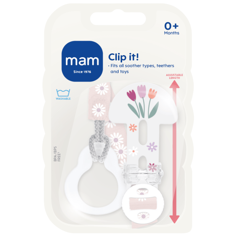 Værd at vide om MAM Clip it! Pink (1 stk): - Du kan nemt fjerne ringen fra snoren, hvorefter du kan montere den direkte på sut, bidering eller noget andet. - Suttesnoren er uden BPA og BPS. - Den kan nemt gøres rent.
