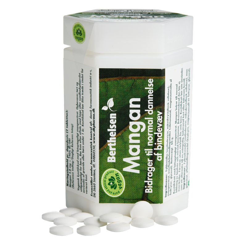 Berthelsen Mangan - letoptageligt mangancitrat og organisk bundet. Certificeret dfi Vegan - derved velegnet til veganere og vegetarer.