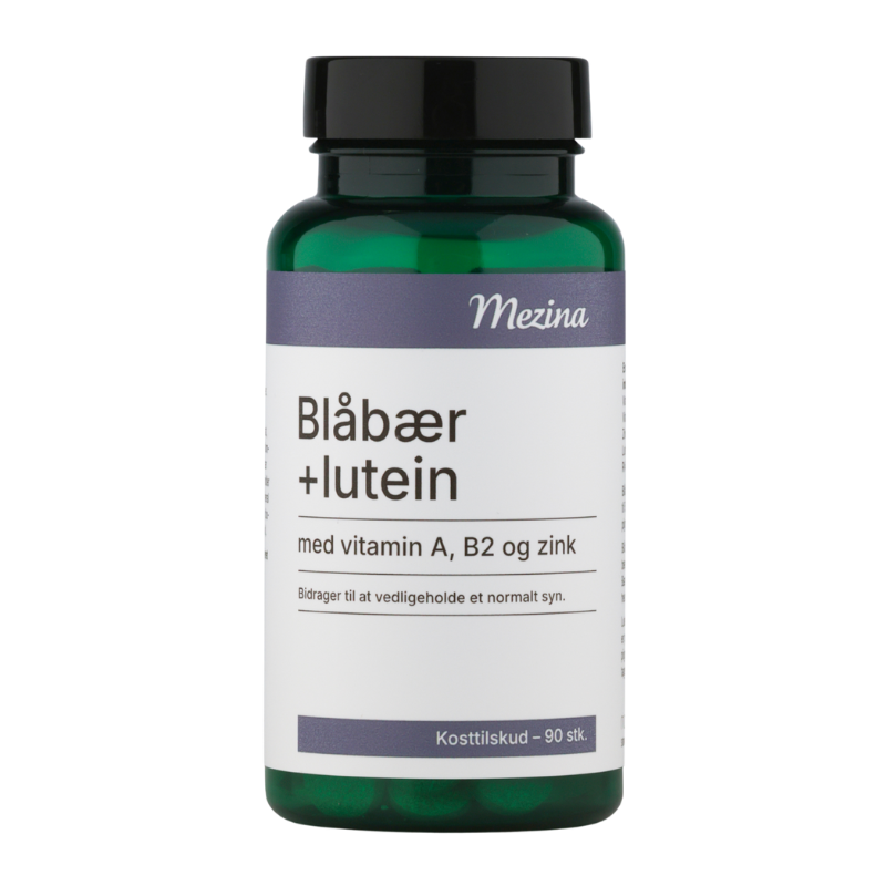 Mezina Blåbær & Lutein støtter syn, hud og velvære med blåbærekstrakt, lutein, zink og vitaminer. Naturligt kosttilskud mod træthed og oxidativt stress.