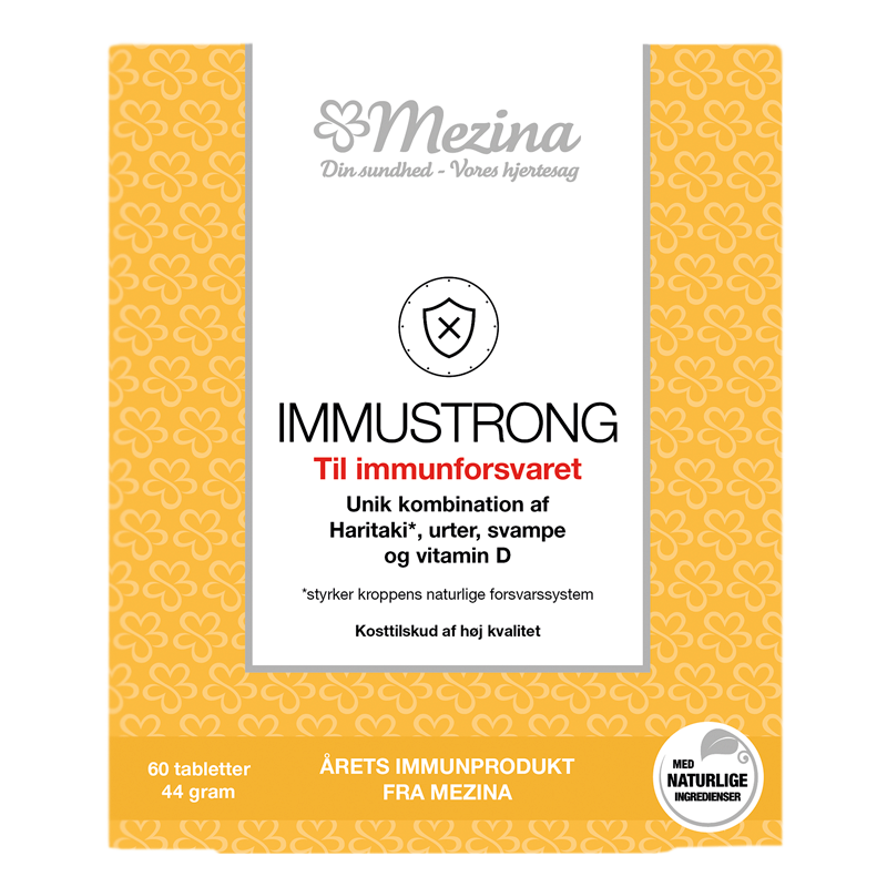 Immustrong indeholder D‑vitamin samt naturlige ekstrakter af reishi, haritaki og astragalus.