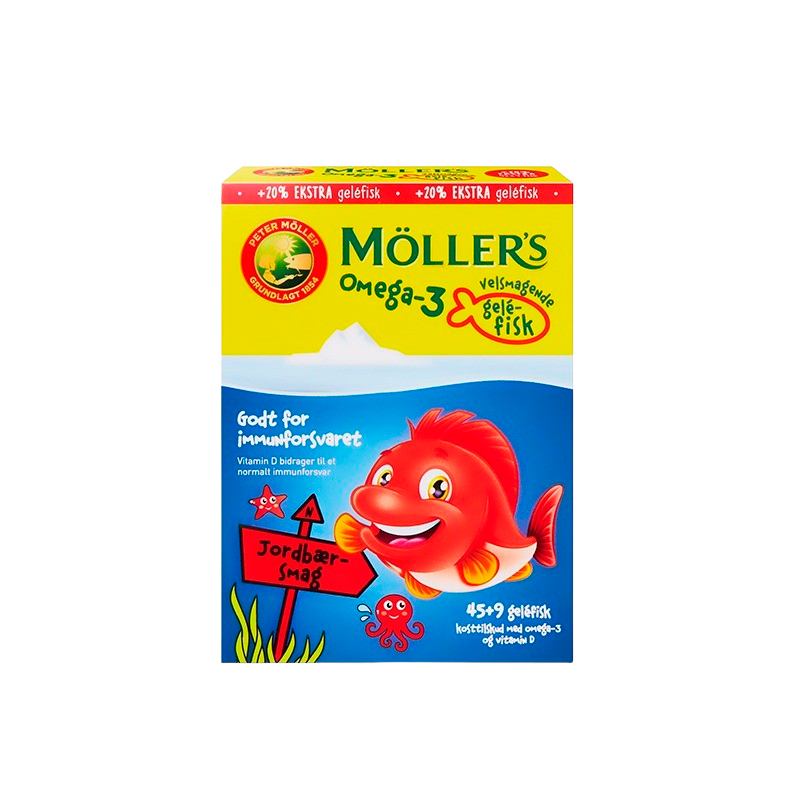 Med disse geléfisk tilsat jordbærsmag, vil det gøre det nemmere at glæde børnene over indtagelsen af vitaminer, da de smager dejligt og minder om vingummier. De er beriget med EPA og DHA, der bidrager til en normal hjertefunktion. Derudover indeholder de Vitamin D, som bidrager til at vedligeholde immunsystemets normale funktion og til en normal optagelse/udnyttelse af calcium og fosfor.