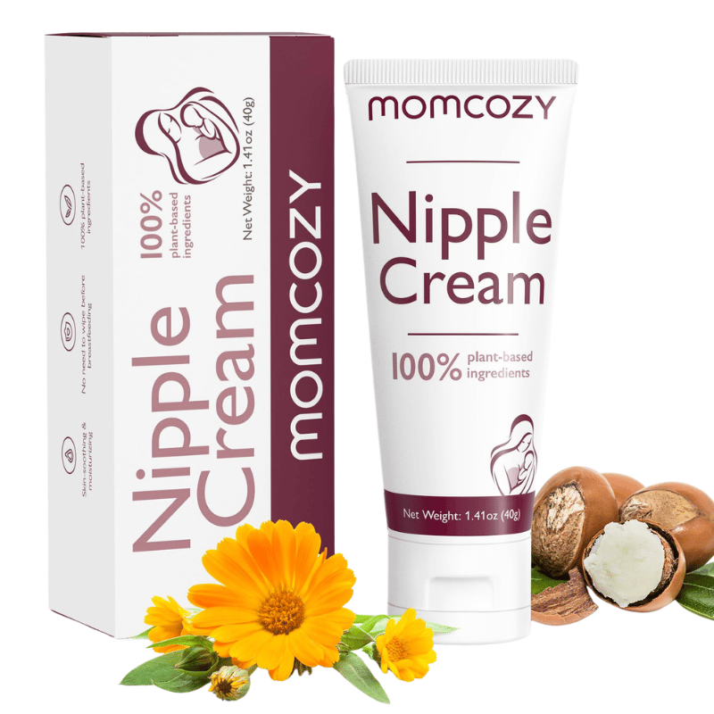Momcozy 100% Naturlig Vegansk Nipple-cream beroliger og beskytter ømme brystvorter med en lanolin-fri, petroleum-fri og duft-fri formel. Sikker for mor og baby—der er ingen grund til at tørre af før amning.