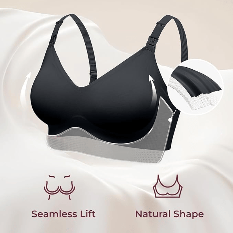 Momcozy YN21 Ammebh i Sort tilbyder smørblød, åndbar komfort med sømløs, trådløs støtte. Den har justerbare puder, et blødt bånd og en én-hånds lukning, hvilket gør den perfekt til amning, pumping og daglig brug.