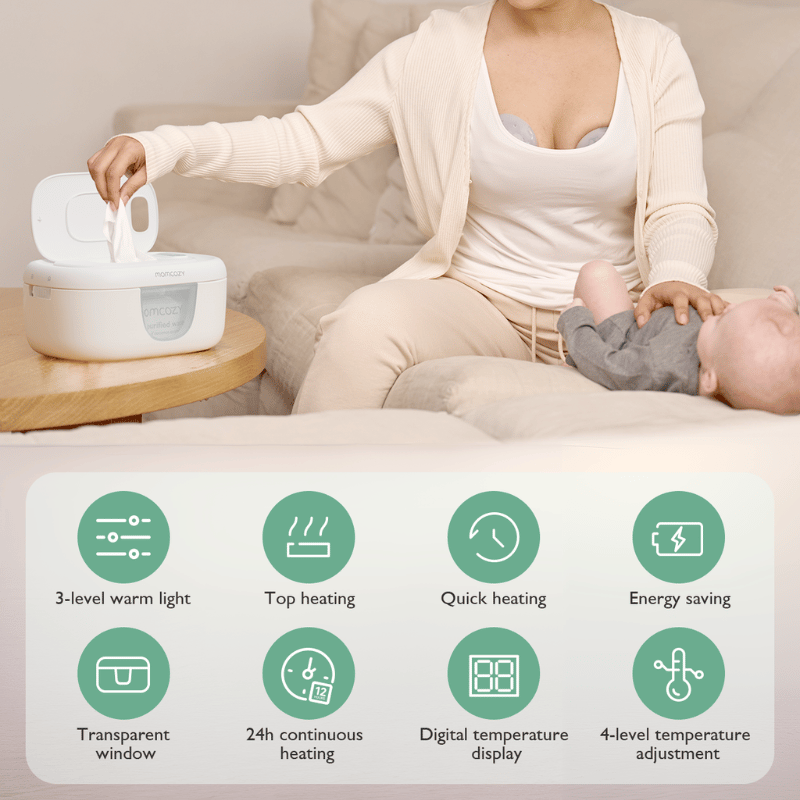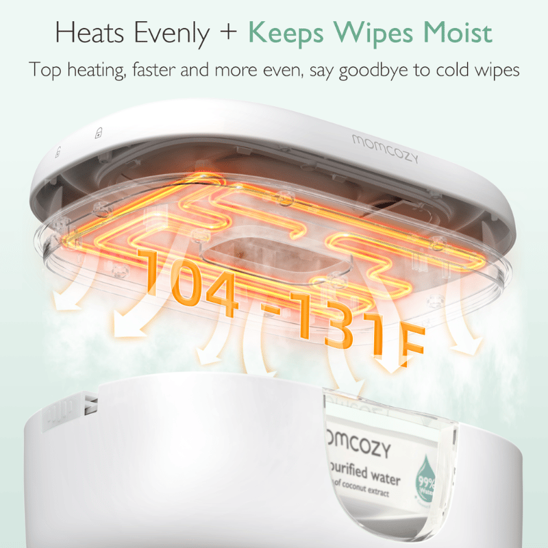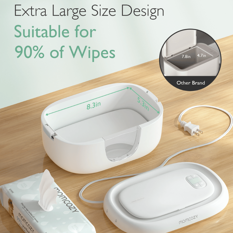 Momcozy Baby Wipe Warmer har et unikt aftageligt designspring for hurtig, jævn opvarmning, så kludene holdes ved den perfekte temperatur - selv med færre klude indeni. Ideel til komfort og bekvemmelighed.