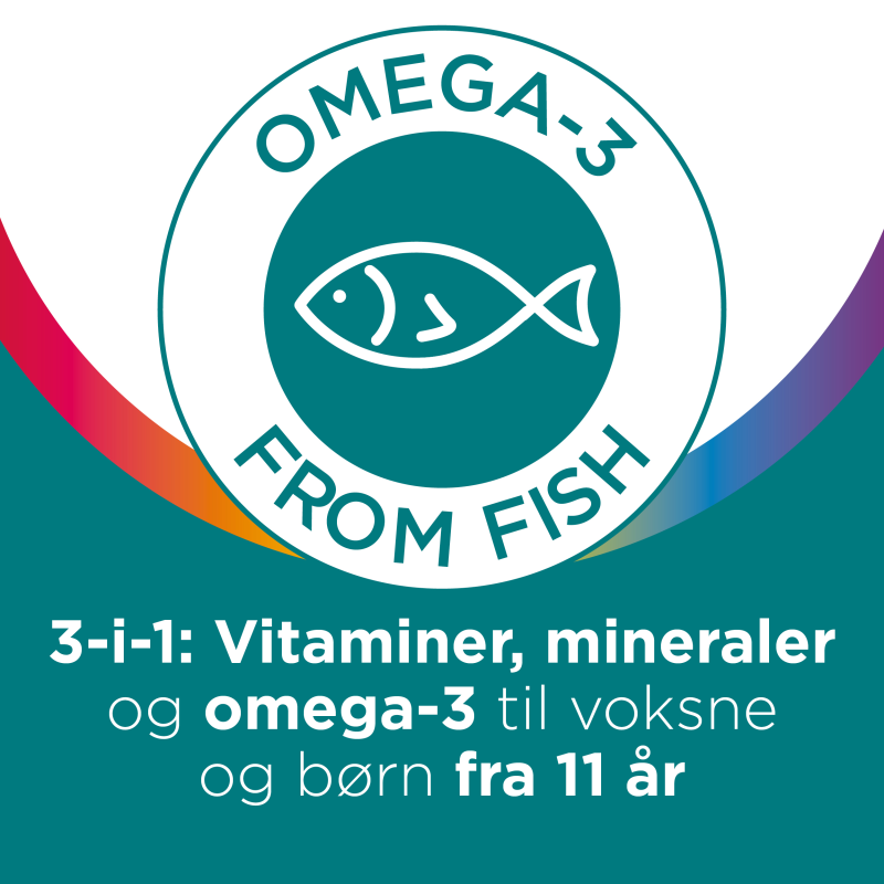 Multi-tabs Complet er et 3i1 kosttilskud for voksne og børn over 11 år. Med 2 kapsler om dagen opnås et dagligt indtag af vitaminer, mineraler og omega-3 fedtsyrer.Indhold