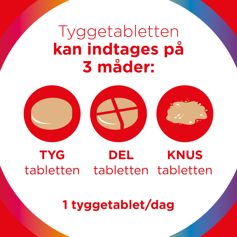 Multi-tabs Kids er tygbare multivitamin- og mineraltabletter til børn. Multi-tabs Kids fås i tre smagsvarianter.Indhold