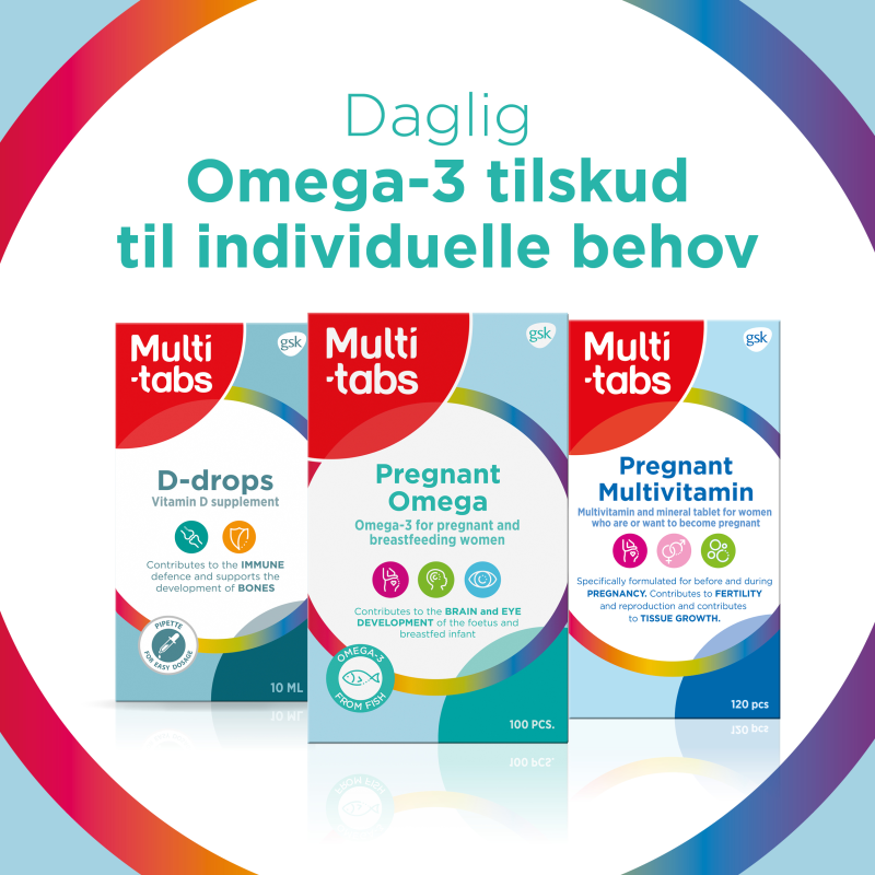Multi-tabs Pregnant Omega er et omega-3 kosttilskud sammensat til at imødekomme behov hos den gravide og ammende kvinde samt hendes voksende barn. Anbefalet daglig dosis: 2 kapsler dagligt.Indhold