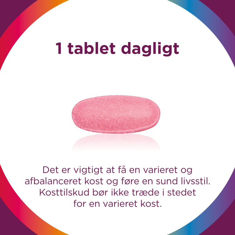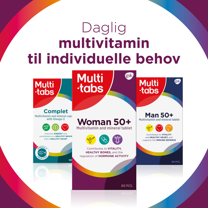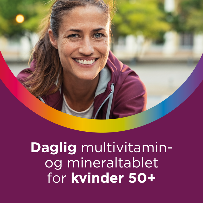 Multi-tabs Woman 50+ er en daglig multivitamin- og mineraltablet tilpasset kvinder over 50 år. Med ekstra vitamin D og kalk. Kalk er nødvendigt for vedligeholdelse af normale knogler samt tænder.Indhold