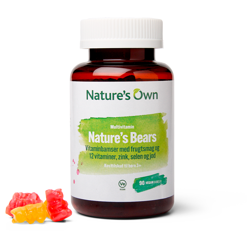 Nature's Bears er 100% vegansk da den indeholder pektin og ikke gelatine. Derudover er der 9 vitaminer, som er vigtige for børn, samt mineralerne jod og zink. Produktet er perfekt til børn der ikke bryder sig om tyggetabletter eller piller der skal sluges. Nature's Bears er super bløde, og kan tygges nemt.