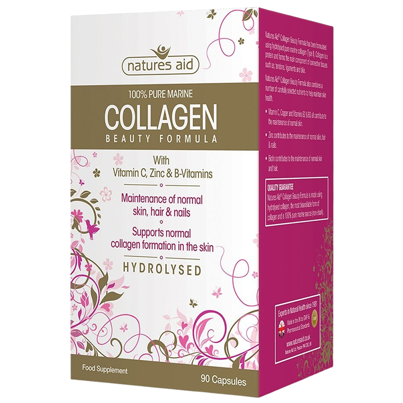 Collagen Beauty Formula fra Natures Aid er marinefremstillet hydrolyseret kollagen med C-vitamin, zink og B-vitaminer. Disse tabletter er udviklet på en formel af hydrolyseret kollagen.