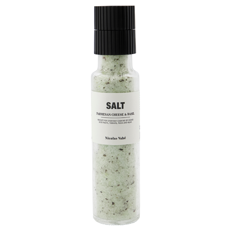 Værd at vide om Nicolas Vahé Salt, Parmesan Cheese & Basil (320 g) - Lækker rund og fyldig smag - Kommer i en flot og praktisk kværn - Populær salt, der er uundværlig i ethvert køkken