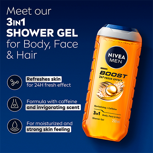 Få en forfriskende start på dagen med Nivea For Men Boost Shower. Denne alsidige 3-i-1 shower gel er designet til at rense krop, ansigt og hår, og efterlader huden med en følelse af energi og pleje.