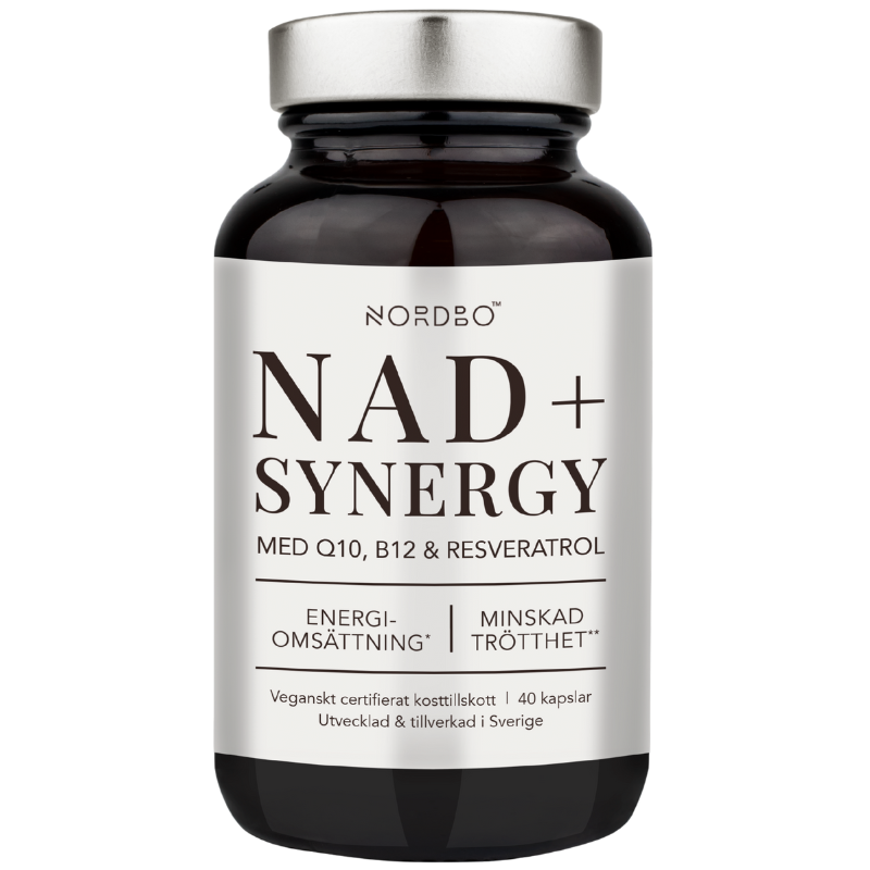 Støt dit energiniveau og mindsk træthed med Nordbo NAD+ Synergy. Dette veganske kompleks kombinerer vitamin B12 med NAD+, Q10 og resveratrol for at understøtte dit daglige velvære og et normalt energistofskifte i en synergistisk formel.