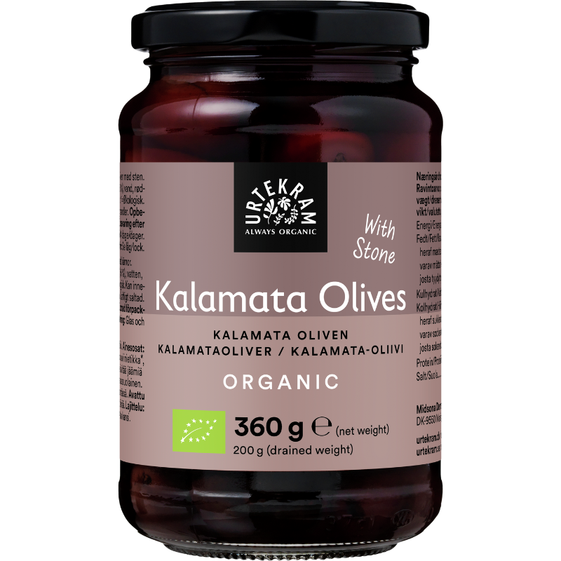 Kalamon-oliven økologisk 360 g. Kalamon er en af de græske stjerner med sit semi-faste bid og en meget kompleks og frugtig smag. Samme sort som sin eftertragtede tvilling Kalamata, men dyrkes ikke i helt samme område. Høstes lige når vinteren står for døren og lagres i 6 måneder.
