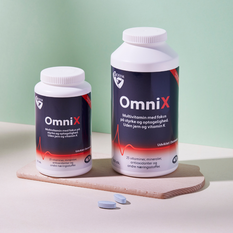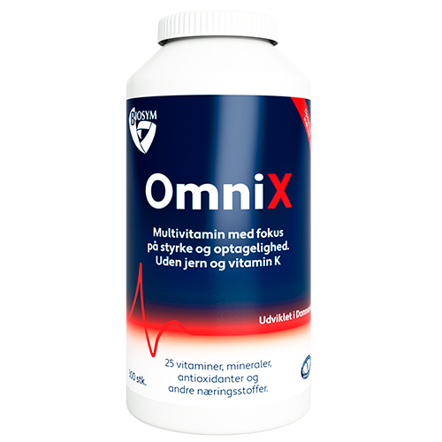 Biosym OmniX er et alsidigt, vegetarisk multivitamin uden jern og K-vitamin, med høj optagelighed og støtte til immunforsvar, energi og nervesystem.