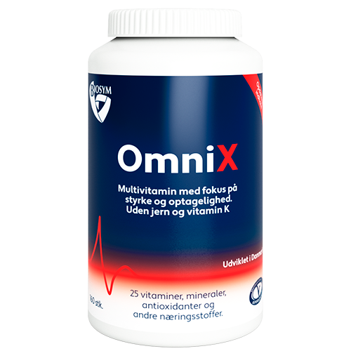 Biosym OmniX er et alsidigt, vegetarisk multivitamin uden jern og K-vitamin, der støtter immunforsvar, nervesystem og energi – ideel ved blodfortyndende medicin.