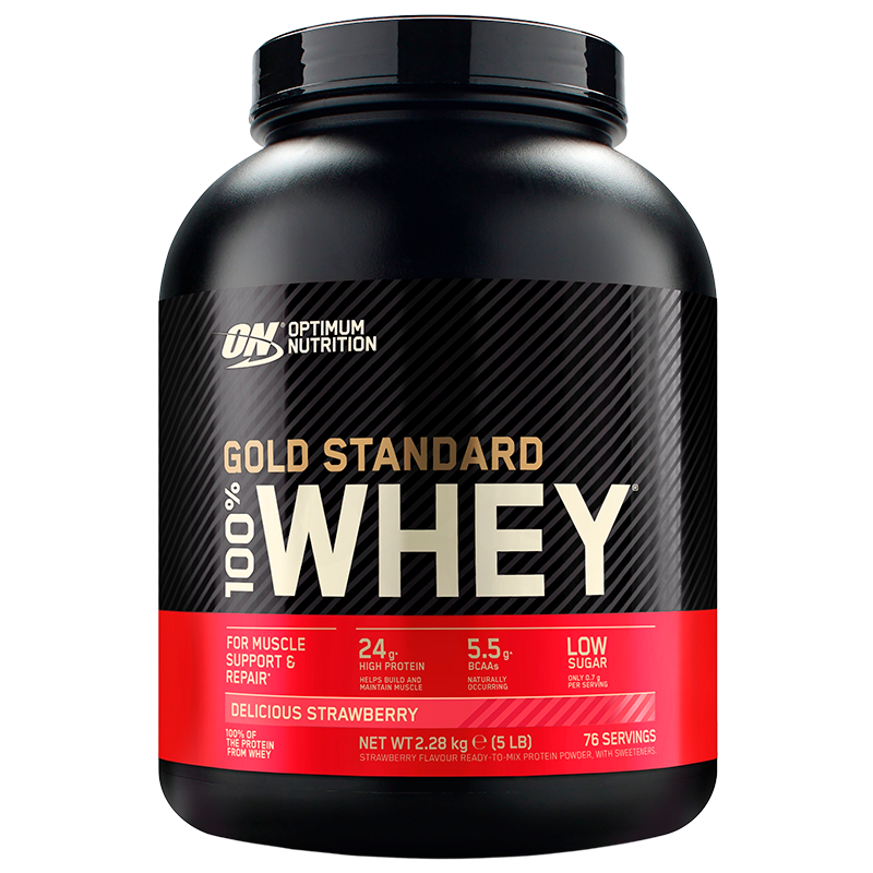 Optimum Nutrition Whey Gold Standard 100% Delicious Strawberry (2280 g) er et velsmagende post træning kosttilskud, der er egnet til at muskelstøtte og restitution. Dette proteinpulver indeholder 24 gram protein per portion, og hele 5.5 gram naturlig BCAAs per portion, der støtter udholdenhed og restitution.