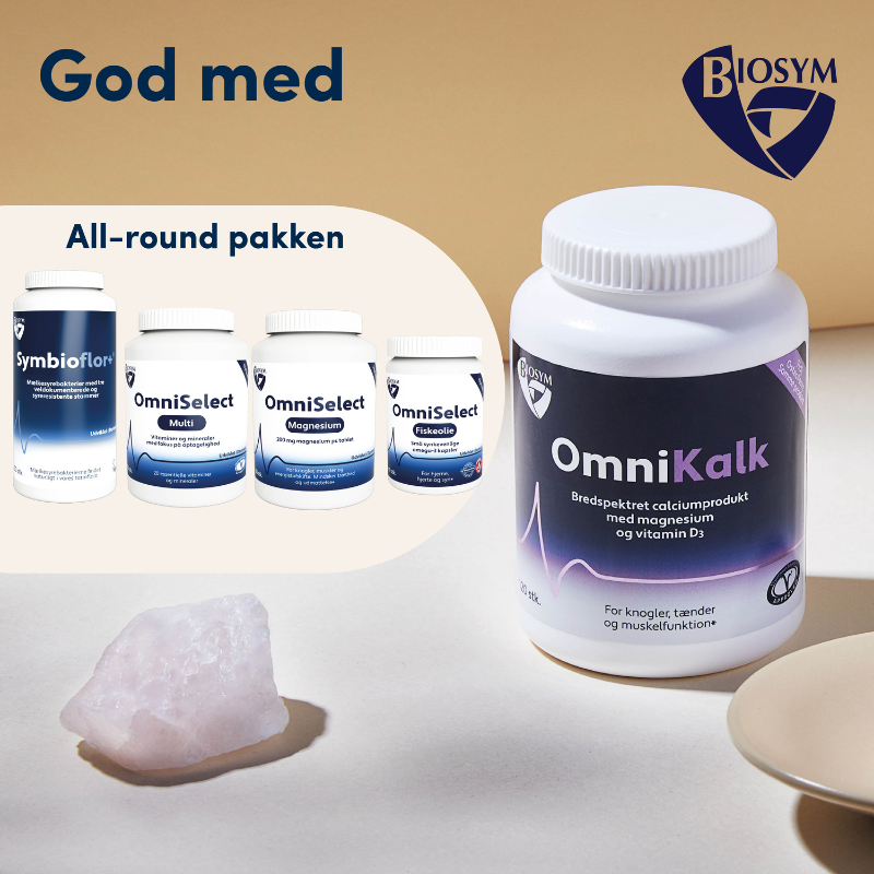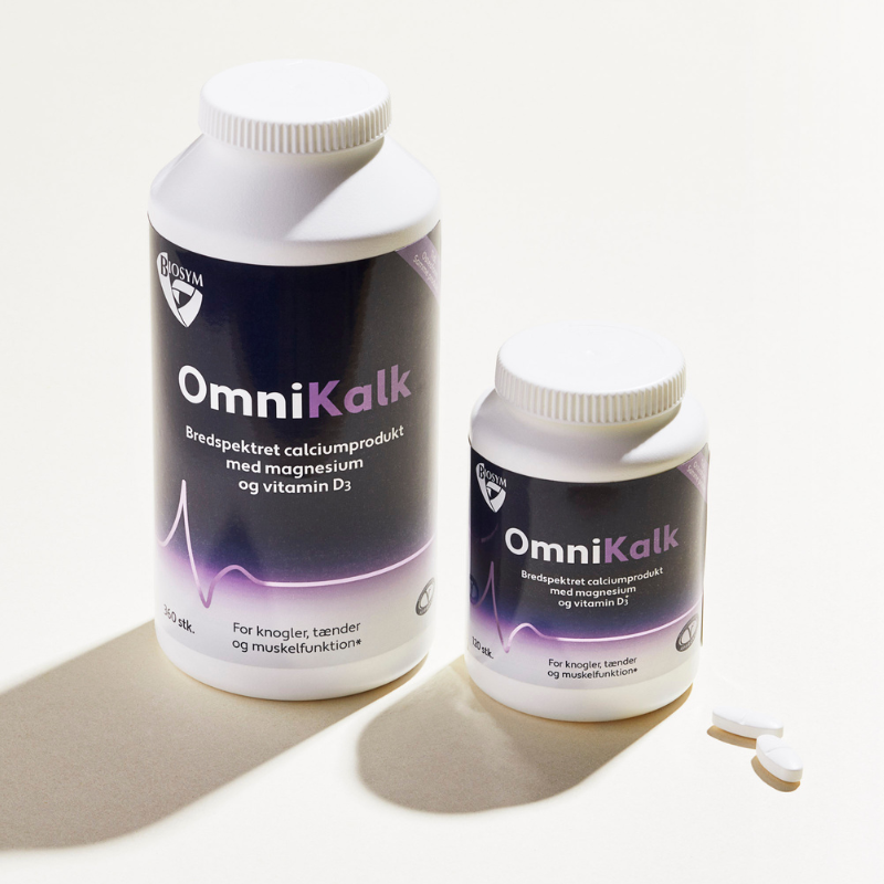 Biosym OmniKalk kombinerer calcium, magnesium og D3 for stærke knogler, tænder, muskler og immunforsvar. Høj kvalitet, dansk produceret kosttilskud.