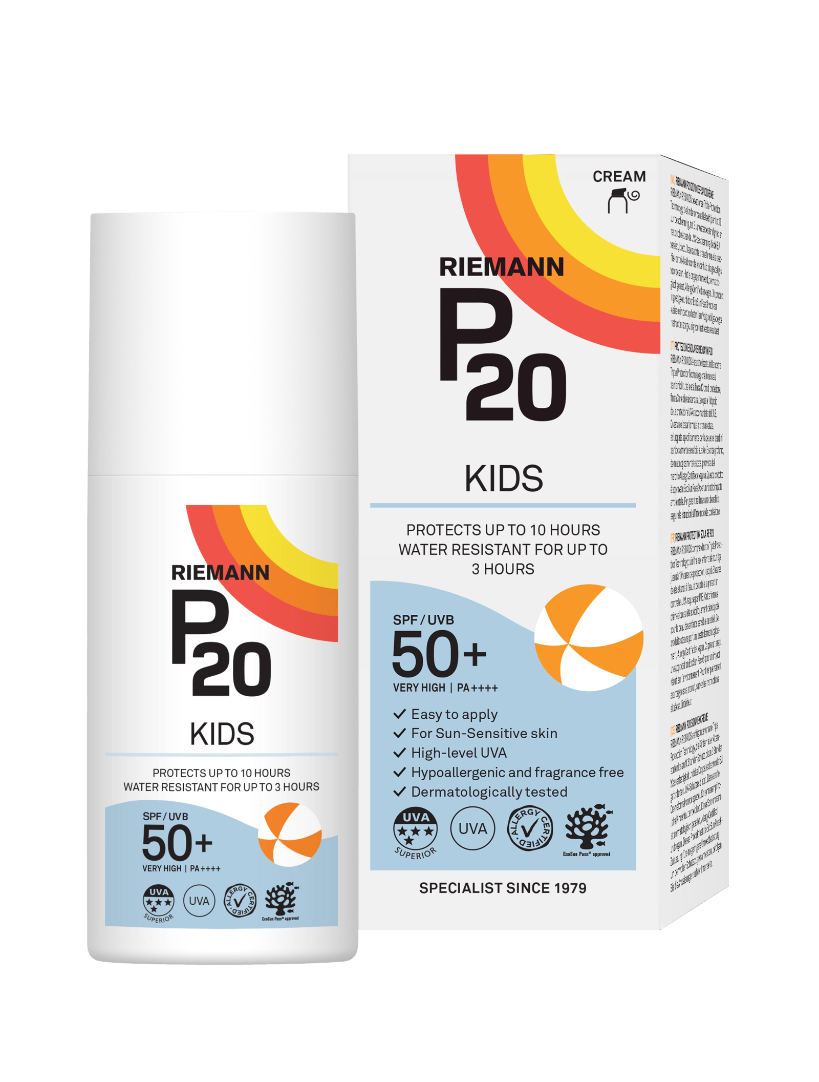P20 Riemann Solcreme Kids SPF 50+ (200 ml) er en solcreme med bredspektret UVA- og UVB-beskyttelse, ekstra vandfast, uden parfume, parabener og farvestoffer, velegnet til sensitiv hud.