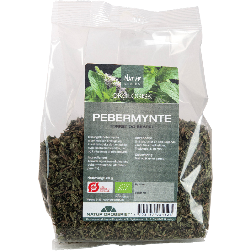Pebermynte fint skåret Ø. Dosering: ½-1 l kogende vand hældes på 2 spiskeskefulde urter. Trækker 10-15 minutter under låg og sies.