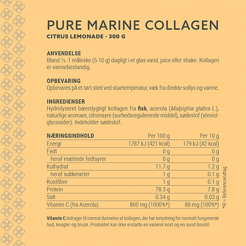 Hovedingrediensen er marint kollagen, som er et af hudens allervigtigste proteiner, der fungerer som et stillads for at bevare fasthed og fugt. Ved at tilføre kroppen dette protein hjælper du med at understøtte hudens struktur og fugtbalance indefra og ud. Plent Pure Marine Collagen Citrus Lemonade (300 g) er baseret på omhyggeligt udvalgte ingredienser for at sikre en ren og effektiv formel, der giver din hud den bedst mulige støtte, så du kan opnå et mere velplejet og strålende udseende, som du vil føle dig godt tilpas med i din hverdag.