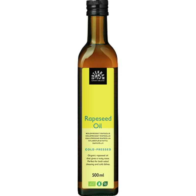 Økologisk koldpresset rapsolie fra Urtekram. Smukke, gyldne dråber med en mild nøddeagtig smag. Koldpresset rapsolie er en klassiker i det nordiske køkken. Kan anvendes til stegning ved lave temperaturer, men er bedst i det kolde køkken.