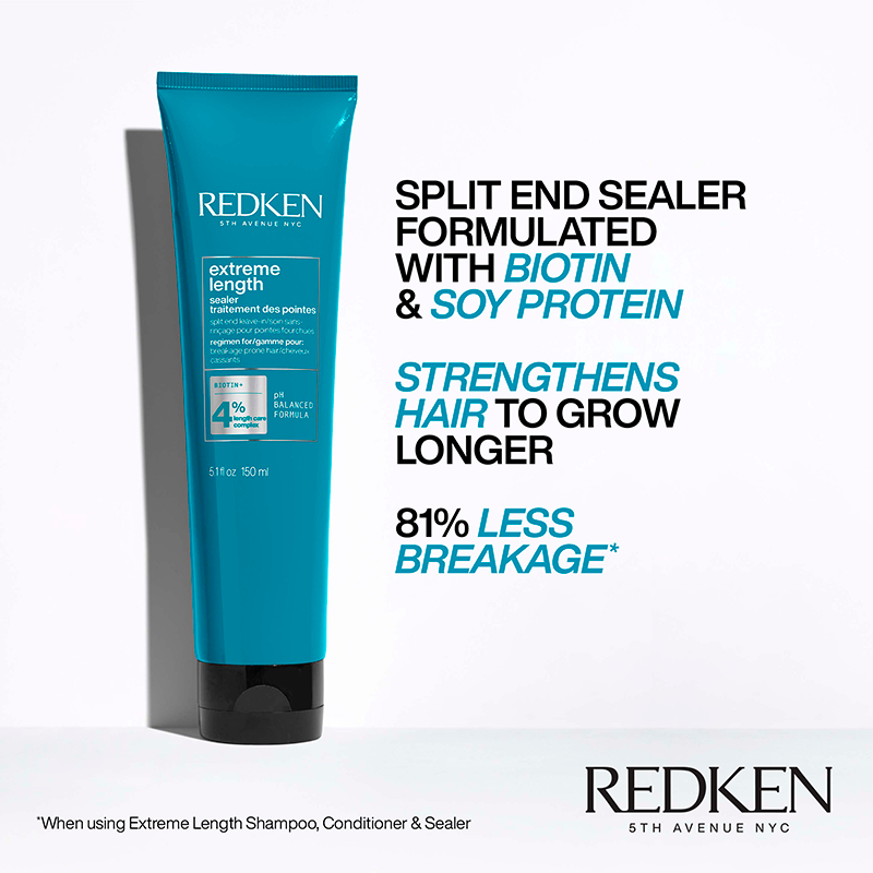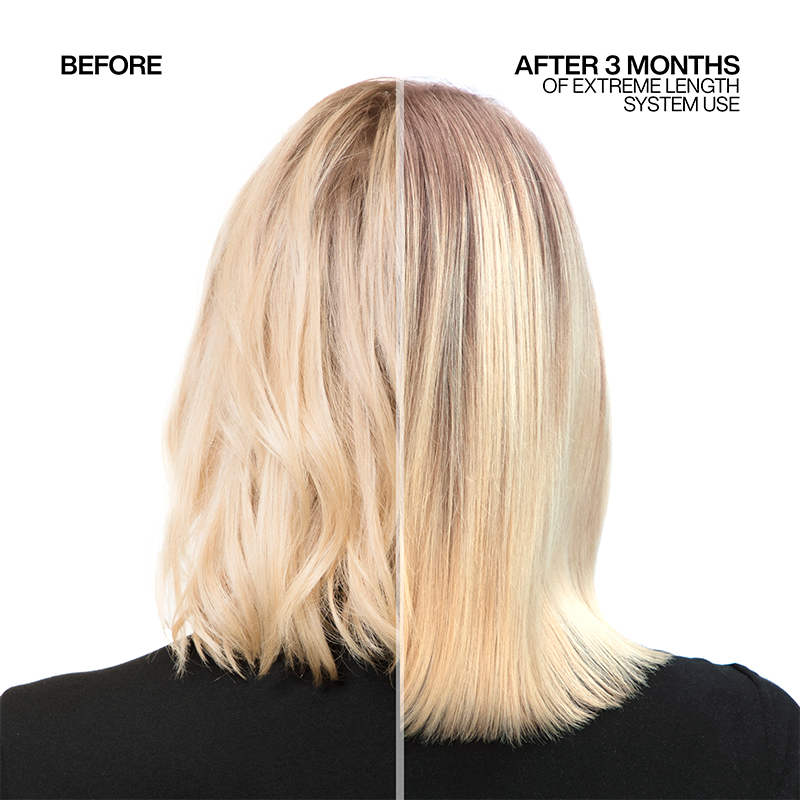 Extreme Length leave-in behandling, hvis formel indeholder sojaprotein og biotin, hjælper til at forsegle og styrke håret samt mindske synligheden af spaltede spidser.