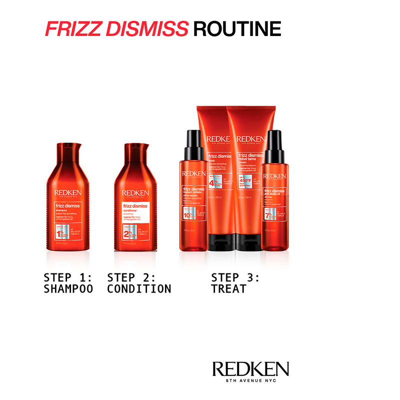 Redken Frizz Dismiss Rebel Tame er en multifunktionel, varmebeskyttende, plejende leave-in creme. Den indeholder Redkens Smoothing Complex og babassuolie, som er fremstillet på solidarisk vis. Denne udglattende creme beskytter håret mod luftfugtighed, reder det ud og beskytter håret mod varme op til 230° C.Ingredienser
