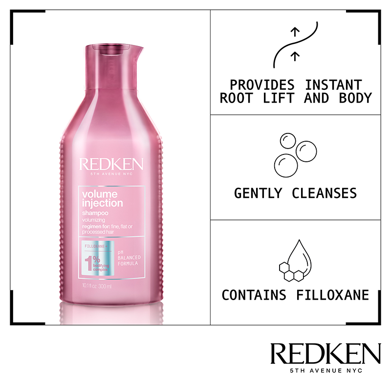 Få fyldigt og voluminøst hår med Redken Volume Injection Shampoo. Den renser skånsomt dit hår og hovedbund, mens den aktivt arbejder for at løfte håret fra rødderne og give et mærkbart boost og en let følelse.